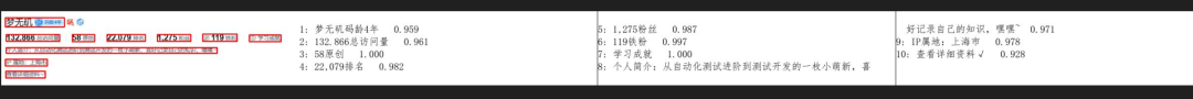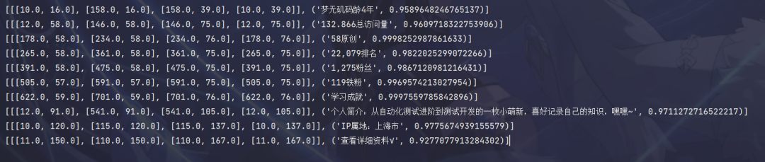 [[[12.0, 91.0], [541.0, 91.0], [541.0, 105.0], [12.0, 105.0]], ('个人简介:从自动化测试进阶到测试开发的一枚小萌新,喜好记录自己的知识,嘿嘿~', 0.9711272716522217)],