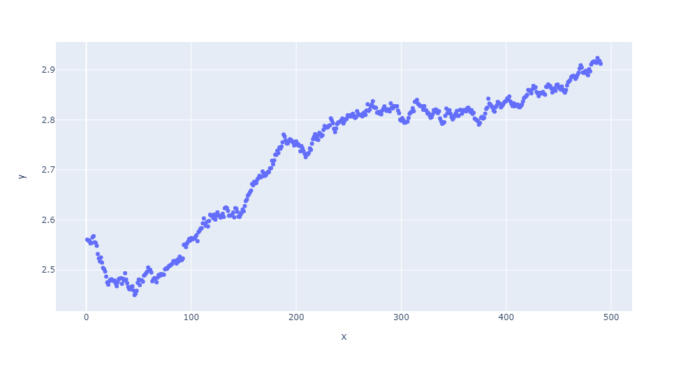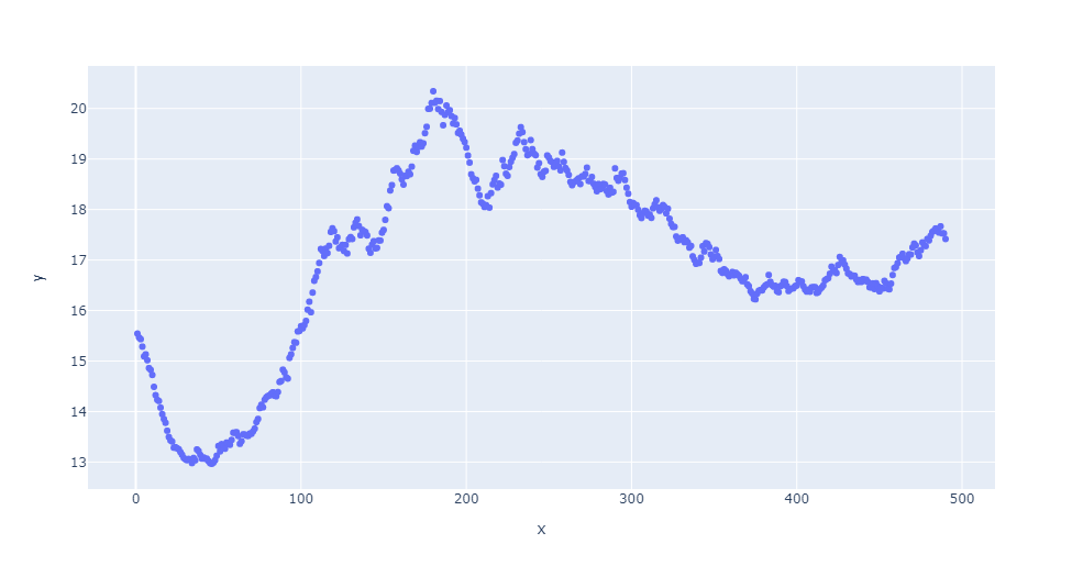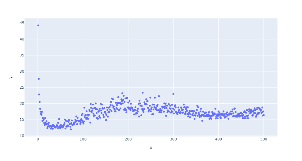 fig = px.scatter(x=epochs, y=smooth_mae_val)
