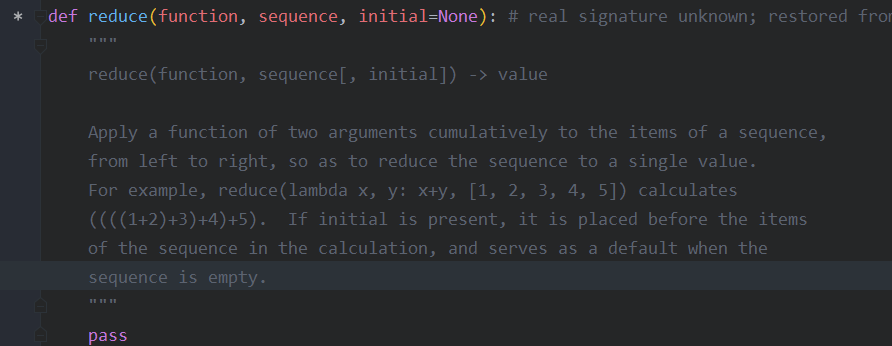 可以看到,reduce有三个参数,第一个是函数function,第二个是序列sequence,第三个是initial,为初始值,默认为None