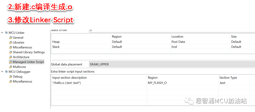 我们新分区出名为“MY_FLASH_O”的Flash3,在source文件夹下新建hello.c,编译生成hello.o,并配置Linker Script将hello.o放入新分区出的Flash中,如下: