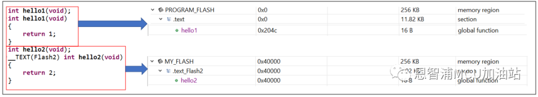 更改代码放置位置的方法如下所示,将代码存入名为“MY_FLASH”的自定义Flash(0x40000-0x80000)中,定义函数: