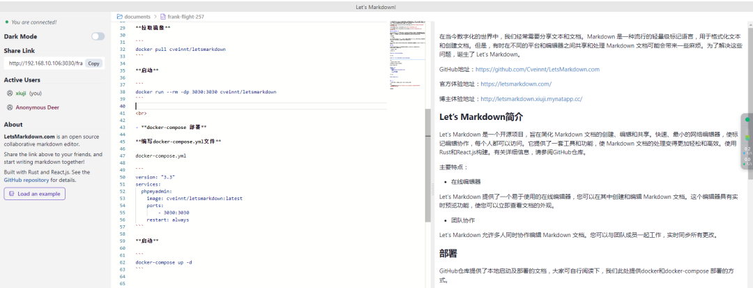 Let's Markdown 是一个开源项目,旨在简化 Markdown 文档的创建、编辑和共享。快速、最小的网络编辑器,使标记编辑协作,每个人都可以访问。它提供了一套工具和功能,使 Markdown 文档的处理变得更加轻松和高效。使用Rust和React.js构建。有关详细信息,请参阅GitHub仓库。
