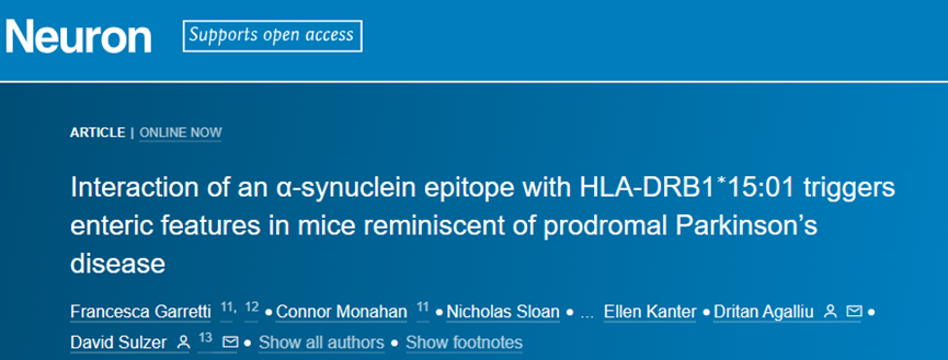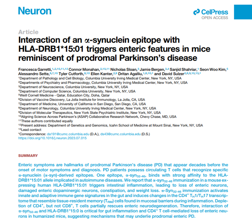 肠道症状是前驱性帕金森病 (PD) 的标志,在运动症状和诊断出现前几十年出现。PD患者拥有可识别特定α-突触核蛋白(α-syn)衍生表位的循环T细胞。α-syn32-46表位可强力结合HLA-DRB1∗15:01 等位基因,该基因与自身免疫性疾病有关。我们的研究表明,在表达人HLA-DRB1∗15:01的小鼠模型中,接种α-syn32-46引发肠道炎症,导致肠道神经元丢失、肠道多巴胺能神经元受损、便秘和体重减轻。α-Syn32-46免疫接种会激活肠道中的先天性和适应性免疫基因特征,并诱导CD4 T+H1/TH17(在炎症期间粘膜屏障中发现类似组织驻留记忆(TRM)细胞)的转录组。缺失CD4细胞,但不是CD8,T细胞可在一定程度上挽救肠道神经变性。因此,α-syn++32-46和 HLA-DRB1∗15:01的相互作用对于人源化小鼠肠道炎症和 CD4 T 细胞介导的肠道神经元丢失至关重要,提示可能是前驱性帕金森病的分子机制。