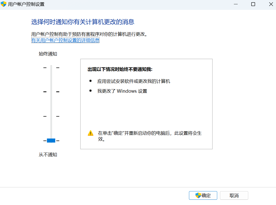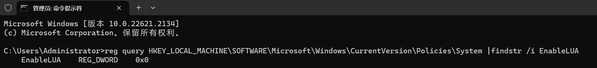 reg query HKEY_LOCAL_MACHINE\SOFTWARE\Microsoft\Windows\CurrentVersion\Policies\System |findstr /i EnableLUA结果如果是: EnableLUA REG_DWORD 0x0,代表UAC关闭