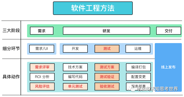 影响产品质量的因素很多:需求质量、设计质量、编码质量、甚至发布时的配置,都会影响最终的交付质量。在和很多测试同学交流后我发现,大部分同学的日常工作主要集中在上图红色加粗字体部分,即主要做的工作是针对性的测试验证。这就和质量保障工作的定义有了冲突。