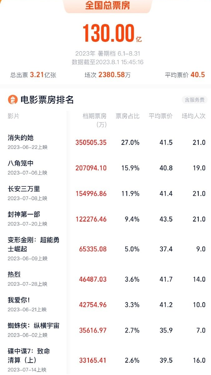 在2023这个观众彻底回归电影院的第一年,可谓是电影行业巅峰一年,消费复苏的风也吹进了影视行业。根据灯塔专业版提供的数据,2023年暑期档(6月1日-8月31日)总票房已经突破130亿元。其中,《消失的她》票房已经超过35亿,《八角笼中》20.7亿;《长安三万里》15亿。