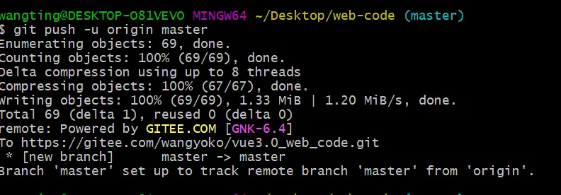 将本地的 master 分支推送到 Gitee 仓库的 master 分支。如果使用的是不同的分支名称,请相应地修改命令。