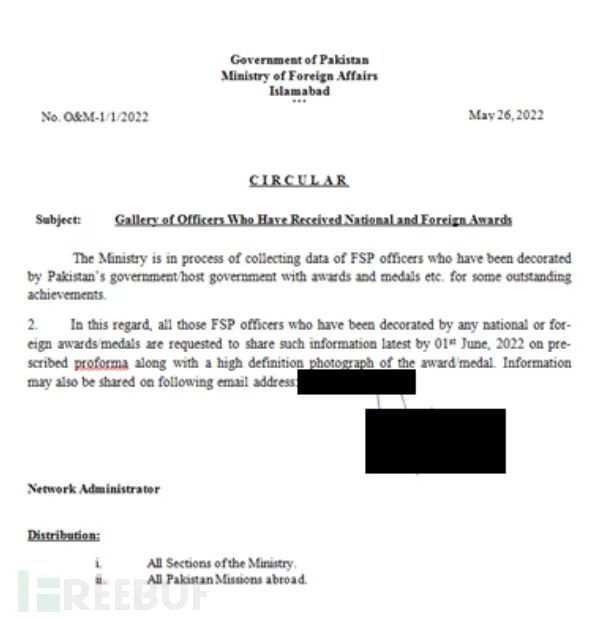 虚假的Skype安装程序是一个名为skype32.exe的.net可执行文件,它包含两个资源:JackalControl木马和合法的Skype for Business独立安装程序。该恶意文件伪装成一份合法的通告,旨在收集巴基斯坦政府授职官员的信息,使用远程模板注入技术利用Follina漏洞下载恶意HTML页面。