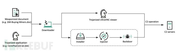 自2018年以来,Lazarus便持续瞄准加密货币相关业务,使用与加密货币业务相关的恶意Word文档和主题来吸引潜在目标。如果目标打开文档并启用宏,则恶意脚本将提取嵌入的下载程序并使用特定参数加载它。Lazarus在这些攻击中使用了两种不同的第二阶段有效载荷:第一个是伪装成UltraVNC查看器的木马化应用程序,第二个是典型的多阶(multi-stage)后门。
