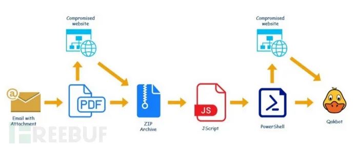 4月初,研究人员检测到使用QBot恶意软件(又名QakBot、QuackBot和Pinkslipbot)的攻击显著增加。该恶意软件是通过附加在商业信函中的恶意文件传播的。黑客可以获取真实的商业通信(从以前的目标电脑上窃取本地存储的电子邮件),并加入对话,发送信息,就像他们在进行一次常规的旧对话一样。这些电子邮件试图说服目标打开伪装成费用清单或其他商业事项的PDF文件。实际上,该PDF包含来自Microsoft Office 365或Microsoft Azure的虚假通知。攻击者利用这一点试图让目标点击“打开”按钮,然后下载一个受密码保护的存档文件,其中包含通知文本中的密码。如果接收者解压缩并运行其中的.wsf(Windows脚本文件),它就会从远程服务器下载QBot恶意软件。