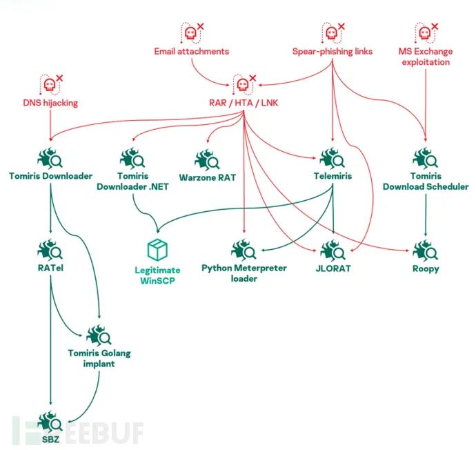 Tomiris习惯使用各种各样的恶意软件植入物,以极快的速度和所有可以想象的编程语言进行开发。该威胁行为者使用的工具分为三类:下载程序、后门程序和文件窃取程序。威胁行为者不仅会开发自己的工具,还会使用开源或商业上可用的植入物和攻击性工具。Tomiris使用了各种各样的攻击媒介:鱼叉式网络钓鱼、DNS劫持、漏洞利用(特别是ProxyLogon)、可疑的drive-by下载和其他“创造性”方法。