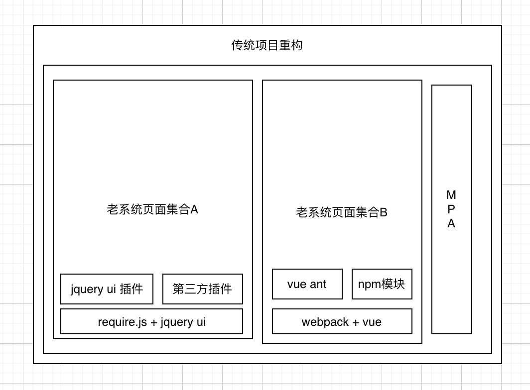 的方式快速爹迭代, 如果是页面级别的迭代, 并且交互比较复杂, 我们可以将老系统的新页面拆离一个子工程, 采用最新的框架(如vue)来开发迭代, 再通过 MPA