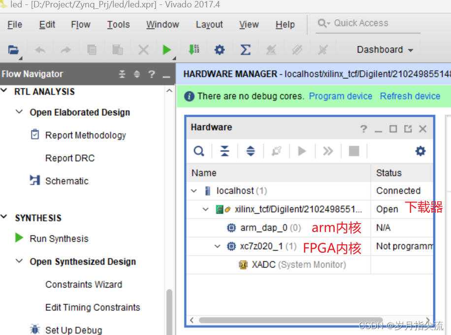 4、可以看到 JTAG 扫描到 arm 和 FPGA 内核(图中为 xc7z020,AC7010 开发板实际为 xc7z010_1,AC7020 开发板实际为 xc7z020_1),还有一个 XADC,可以检测系统电压、温度