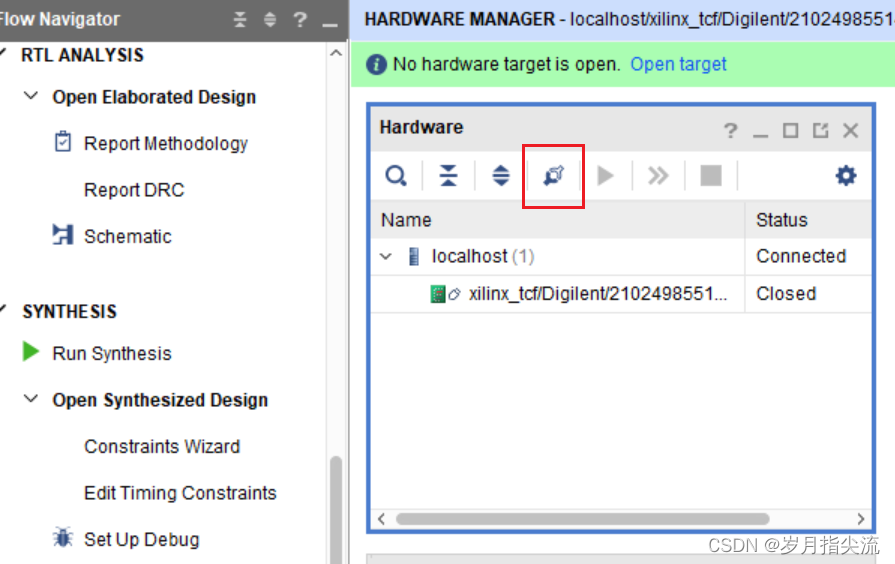 2、连接好开发板的 JTAG 接口(仿真器线),给开发板上电(电源线) 3、在 “HARDWARE MANAGER” 界面点击 “Auto Connect”,自动连接设备