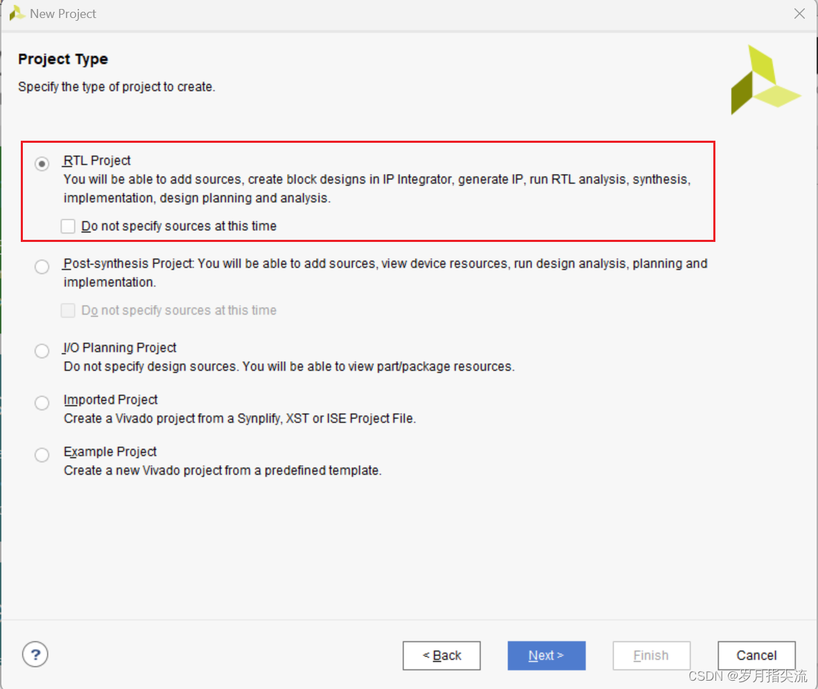 4、在工程类型中选择 “RTL Project”