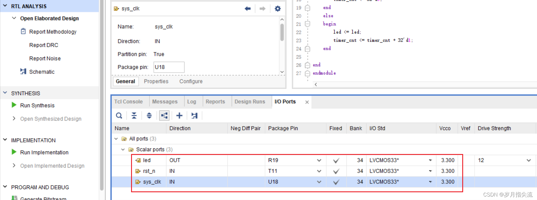 电平标准中 “LVCMOS33” 后面的数字指 FPGA 的 BANK 电压,LED 所在 BANK 电压为 3.3 伏,所以电平标准为“LVCMOS33”。Vivado 默认要求为所有 IO 分配正确的电平标准和管脚编号。