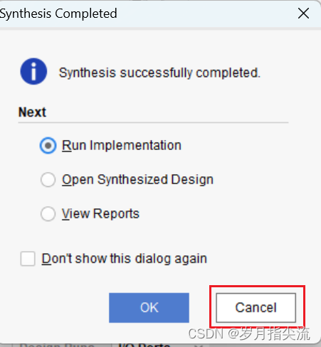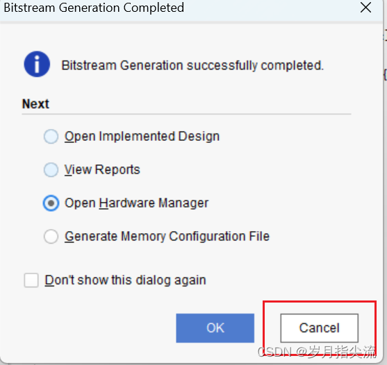 4、编译中没有任何错误,编译完成,弹出一个对话框让我们选择后续操作,若是接下来想要直接下载到 fpga 上可以选择 “Open Hardware Manger”,跳过下面的八、仿真测试,若是接下来想要先进行仿真一下验证下功能可以继续往下看。我这里先进行一下仿真验证下功能,因此点击 Cancel。