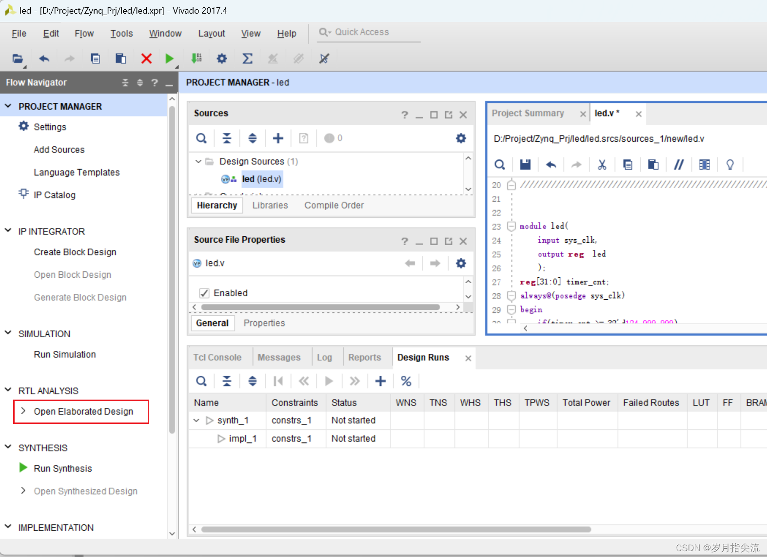 一个 FPGA 设计除了管脚分配以外,还有一个重要的约束,那就是时序约束,这里通过向导方式演示如果进行一个时序约束。 1、点击 “Run Synthesis” 开始综合