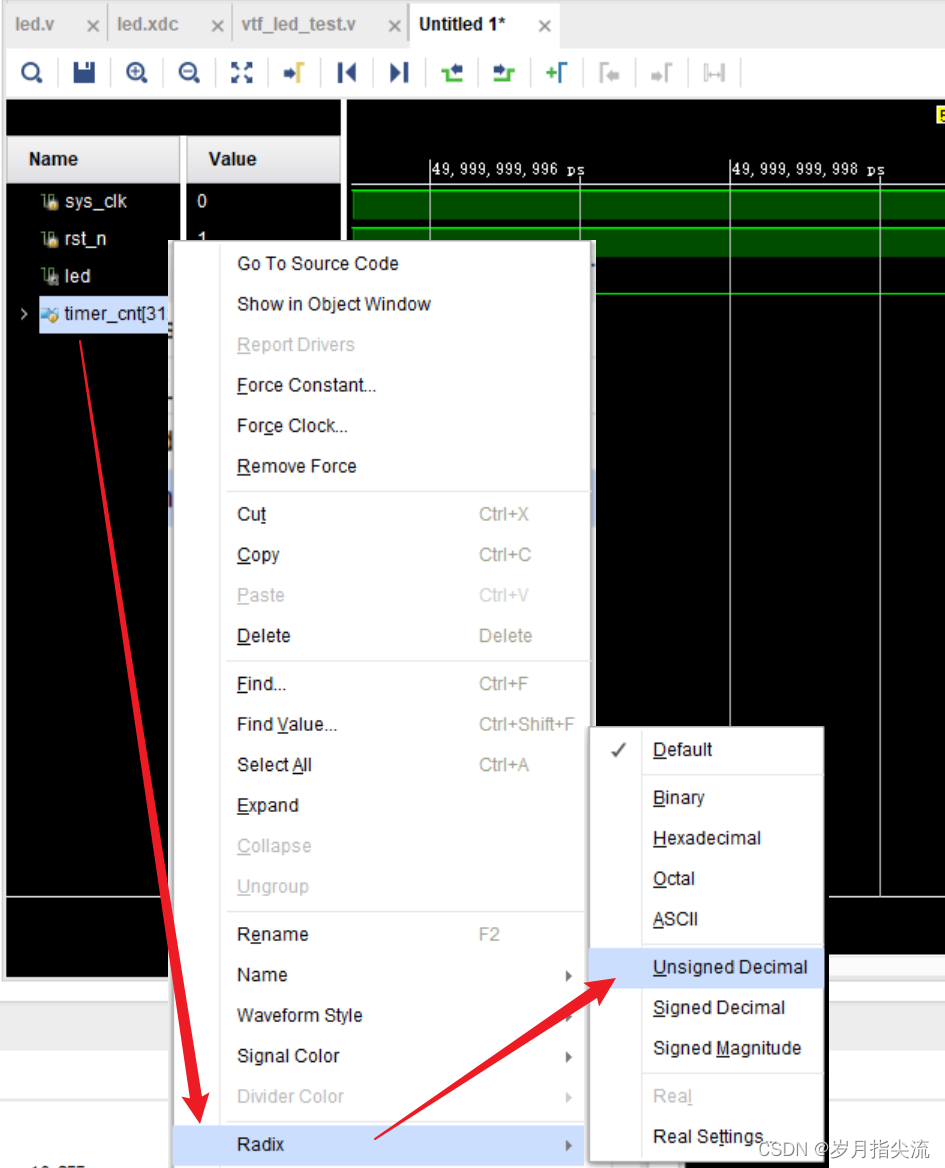 10、timer_cnt 右键 -> Radix -> Unsigned Decimal