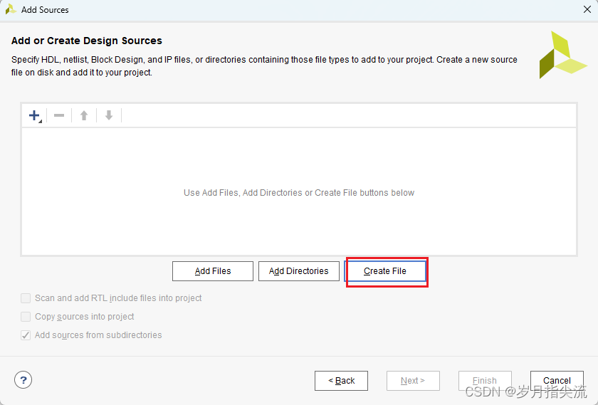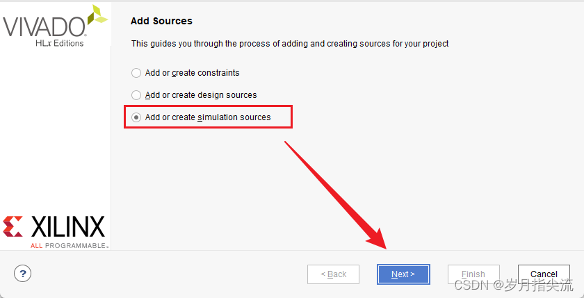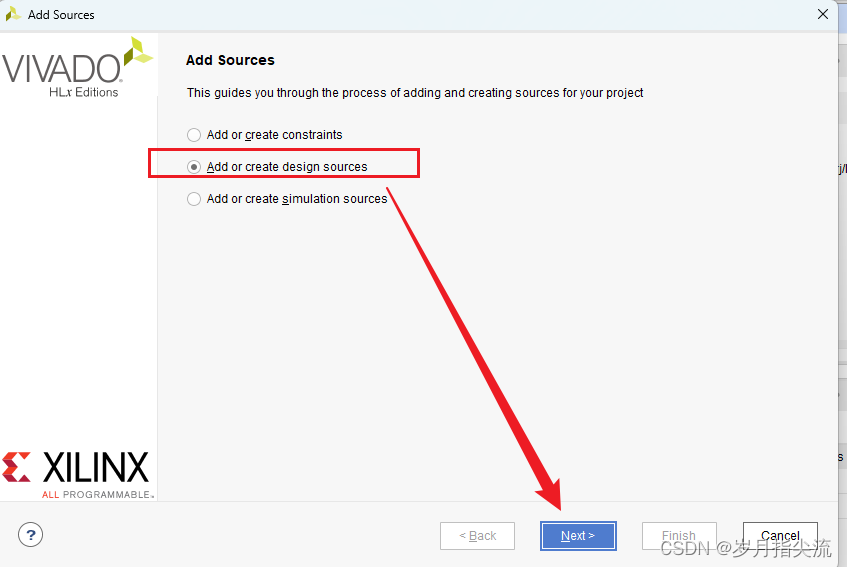 2、选择添加或创建设计源文件 “Add or create design sources”,点击 “Next”