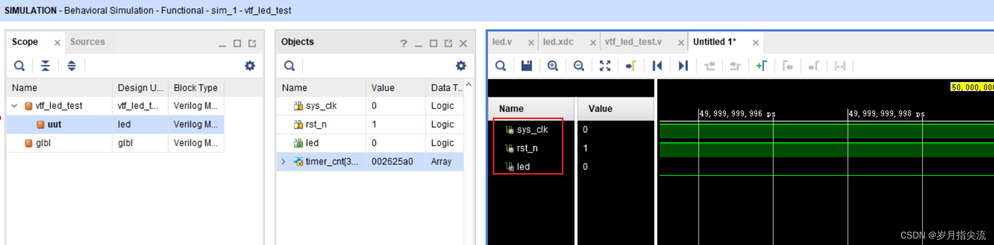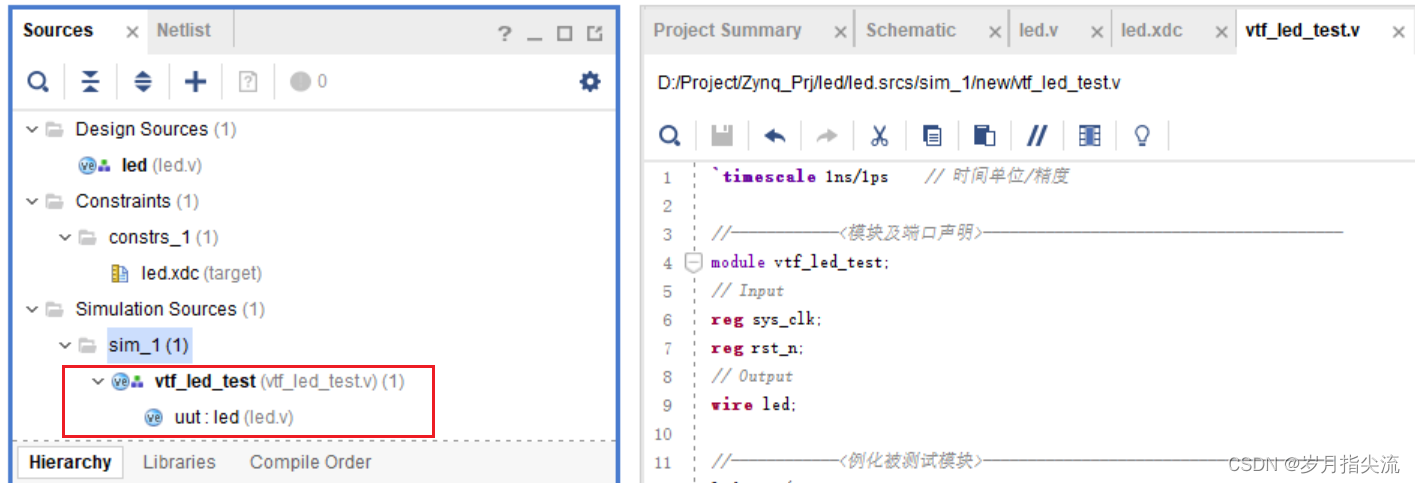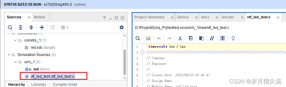 4、在 Simulation Sources 下面可以看到我们创建的 vtf_led_test.v 文件