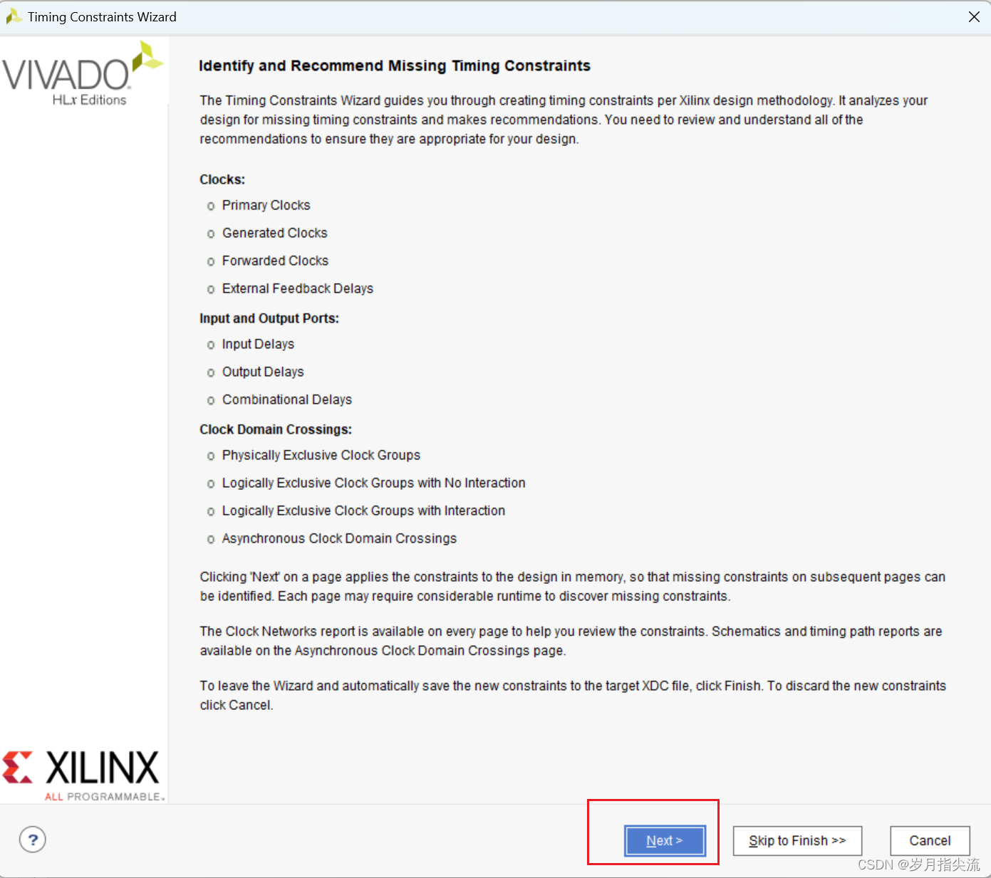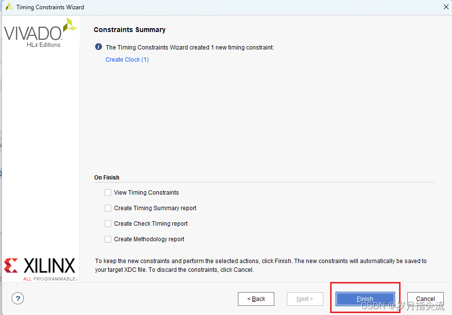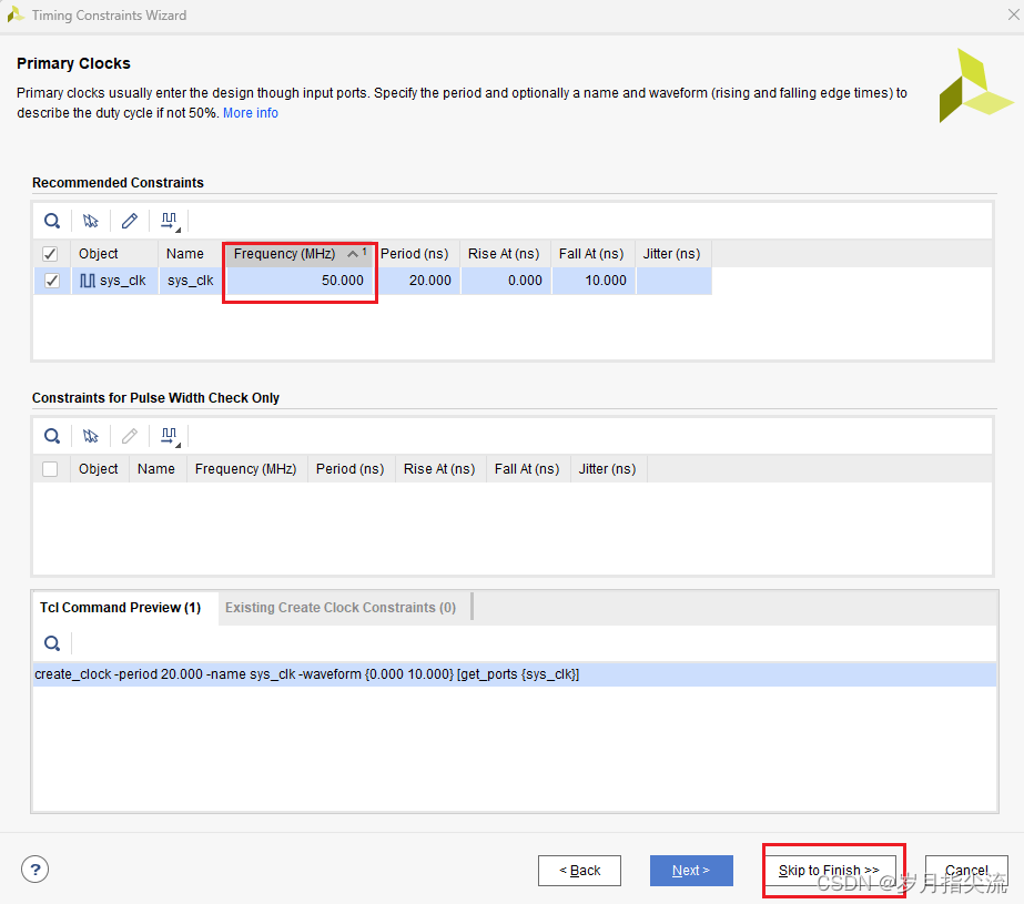 6、时序约束向导分析出设计中的时钟,这里把 “sys_clk” 频率设置为 50Mhz,然后点击 “Skip to Finish” 结束时序约束向导。