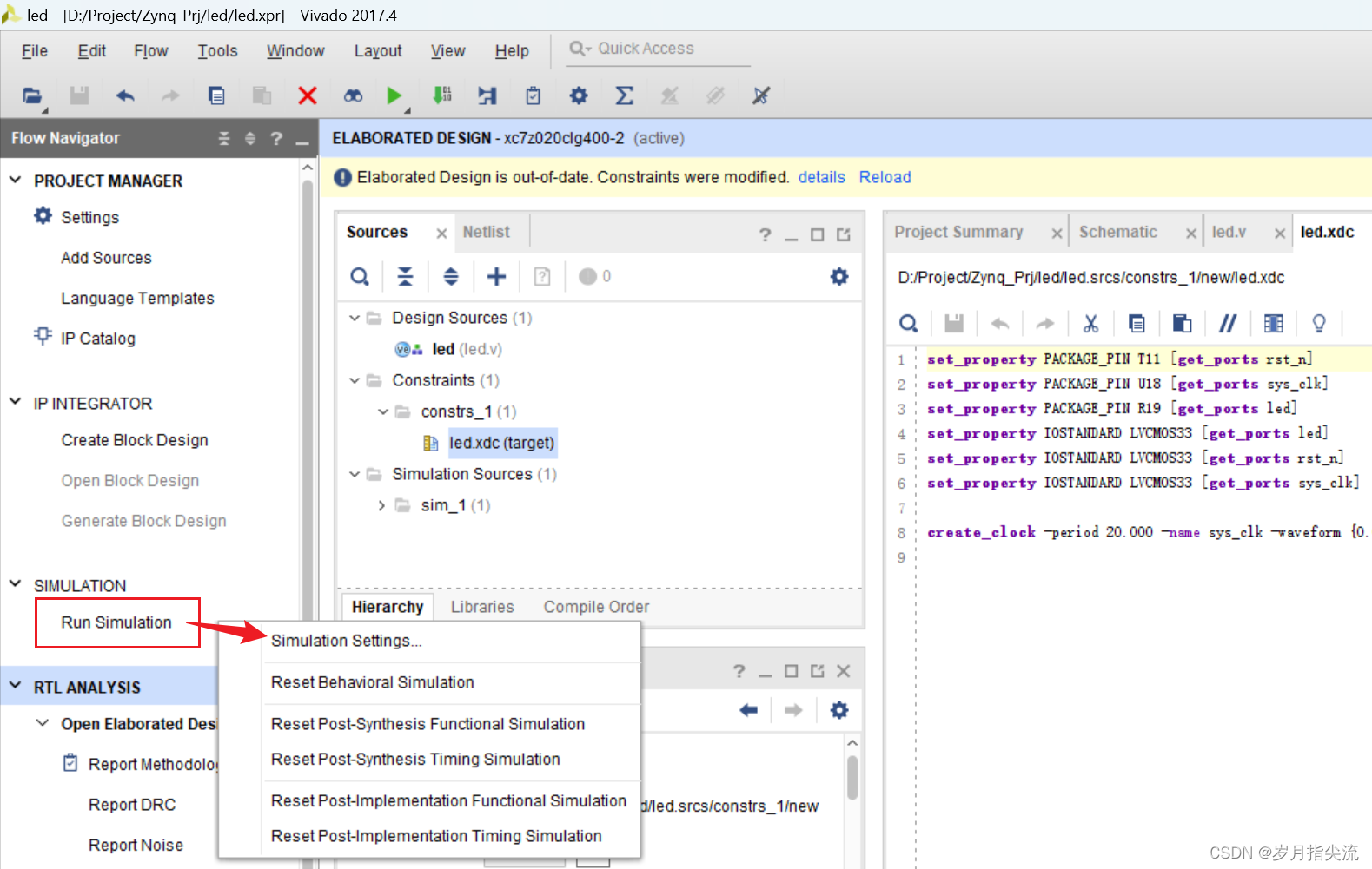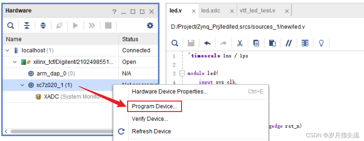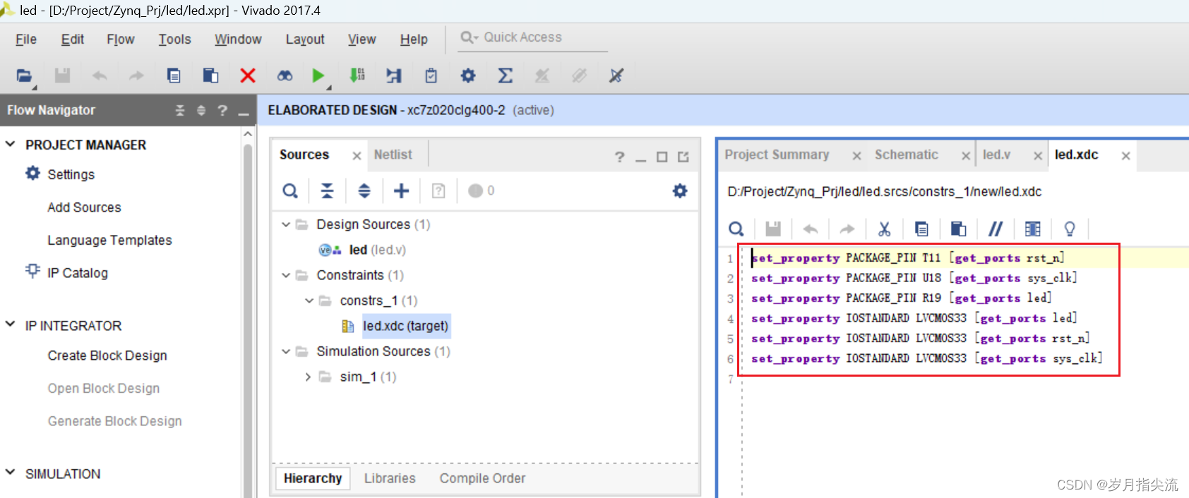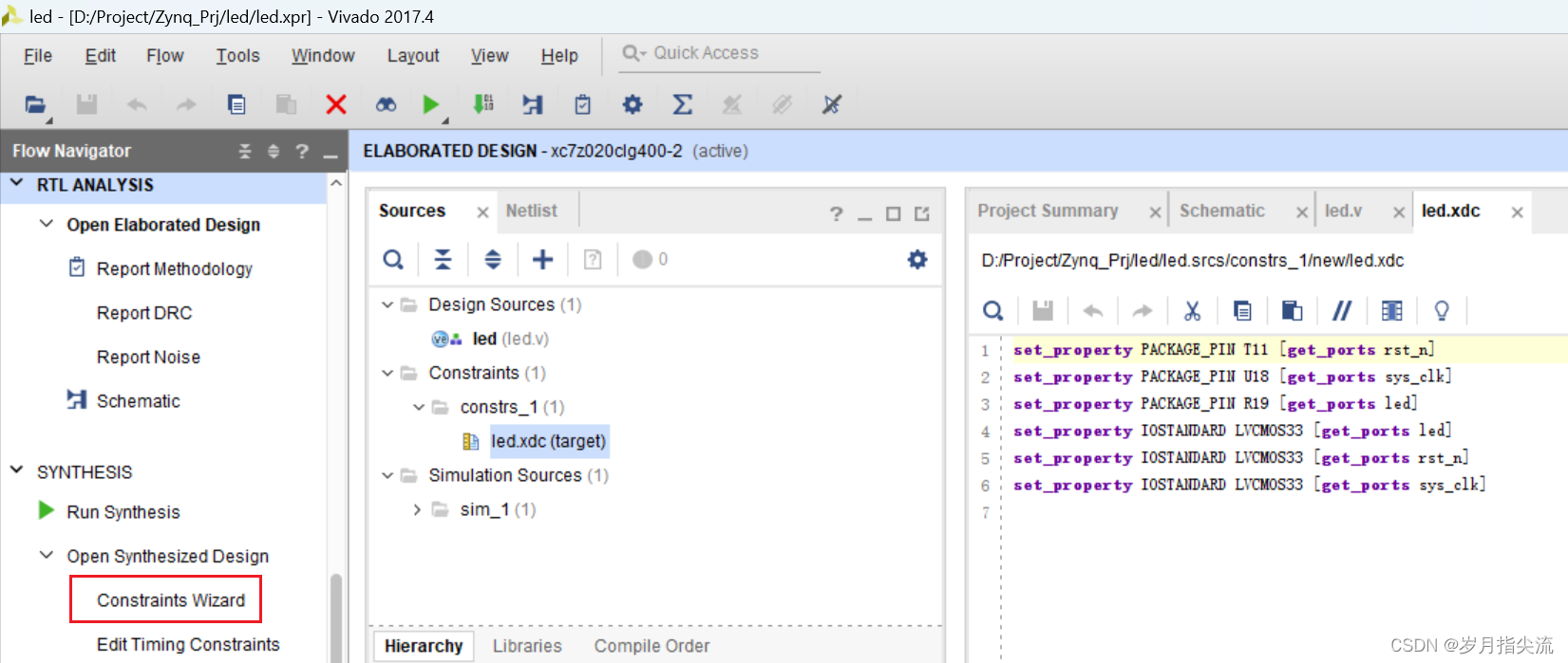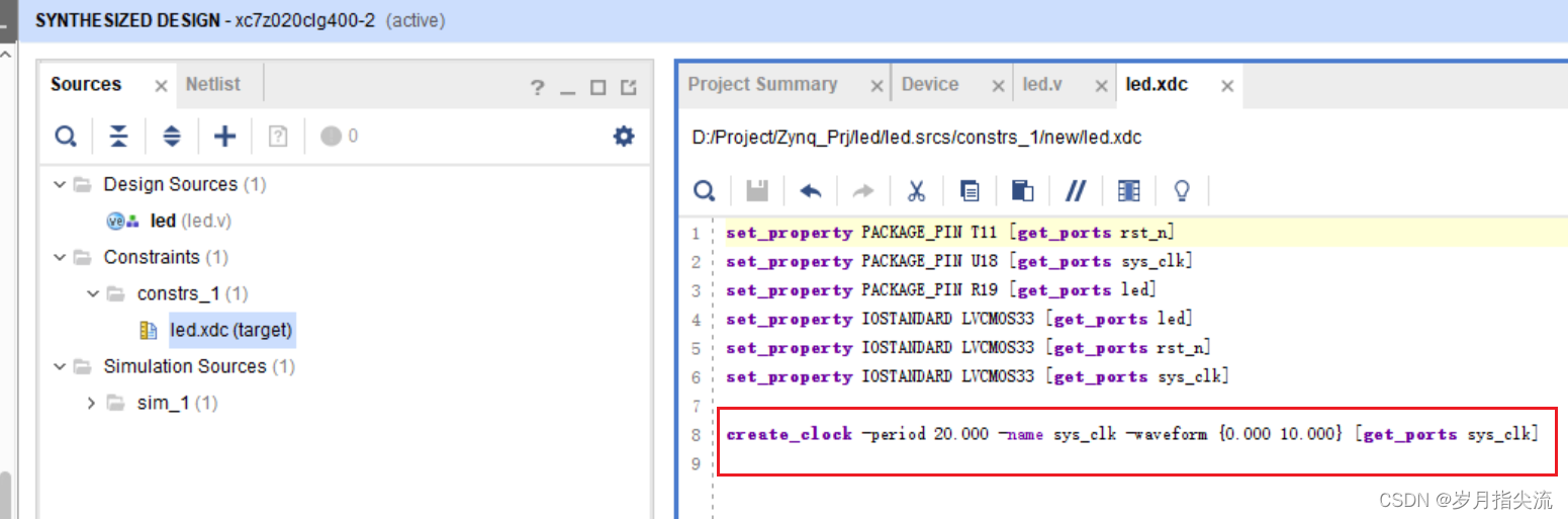 Vivado 使用的约束文件格式为 xdc 文件,xdc 文件里主要是完成管脚的约束,时钟的约束,以及组的约束。这里我们需要对 led.v 程序中的输入输出端口分配到 FPGA 的真实管脚上。