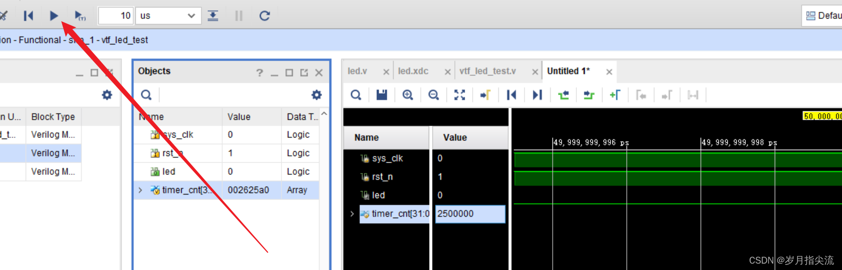 5、把下面的测试代码拷贝到 vtf_led_test.v 中