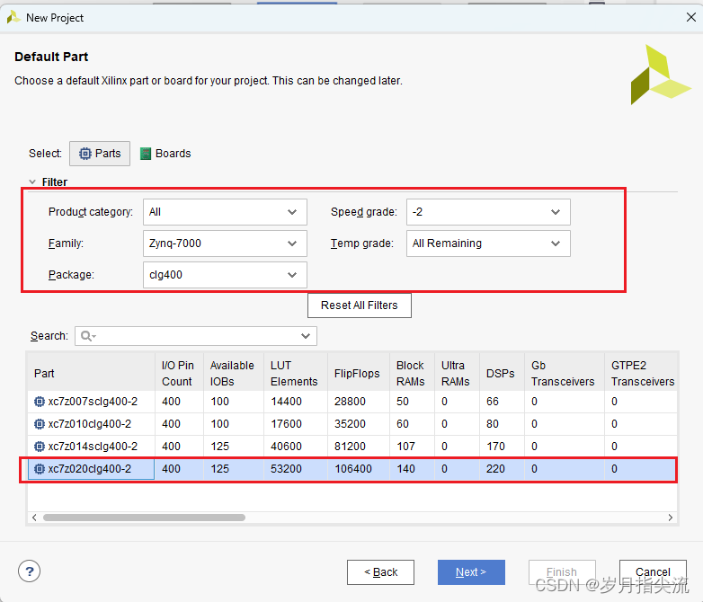 7、在 “Default Part” 选项中,器件家族 “Family” 选择 “Zynq-7000”,封装类型 “Package” 选择 “clg400”,减少我们选择范围。AC7010 在下拉列表中选择 “xc7z010clg400-1”,AC7020 在下拉列表中选择 “xc7z020clg400-2”,“-2” 表示速率等级,数字越大,性能越好,速率高的芯片向下兼容速率低的芯片。