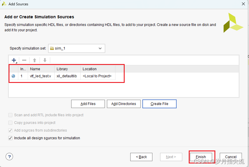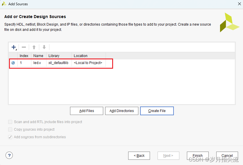 5、点击 “Finish”,完成 “led.v” 文件添加