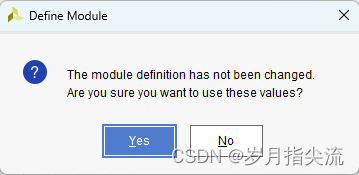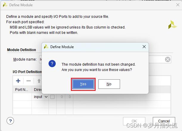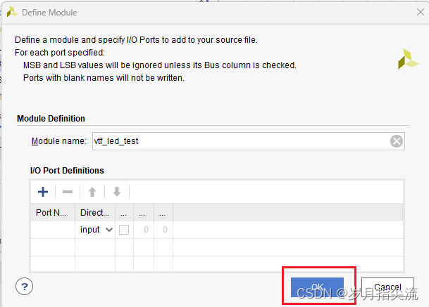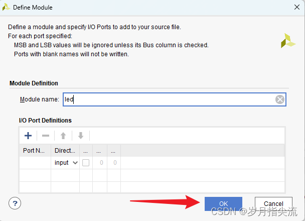 6、在弹出的模块定义 “Define Module” 中可以指定 “led.v” 文件的模块名称 “Module name”,这里默认不变为 “led”,还可以指定一些端口,这里暂时不指定,点击 “OK”