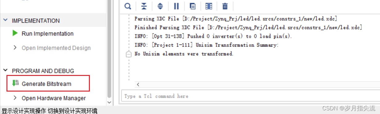 1、编译的过程可以细分为综合、布局布线、生成 bit 文件等,这里我们直接点击 “Generate Bitstream”,直接生成 bit 文件。