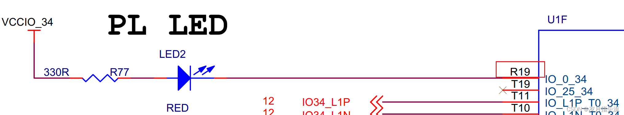 2、我们可以根据原理图的连线关系确定 LED 和 PL 管脚的绑定关系。 LED -> R19