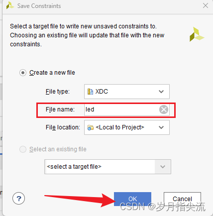 6、弹出窗口,要求保存约束文件,文件名我们填写 “led”,文件类型默认 “XDC”,点击 “OK”