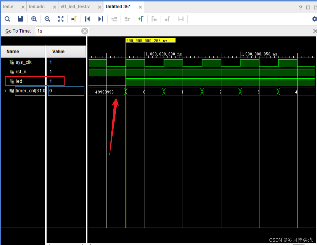 12、等待一会儿时间停止运行,搜索 1s 的时候(右键 Go To Time),可以看 led 从 0 变成了 1,如此反复