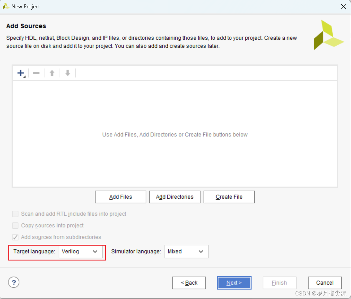 5、目标语言 “Target language” 选择 “Verilog”,虽然选择 Verilog,但 VHDL 也可以使用,支持多语言混合编程。
