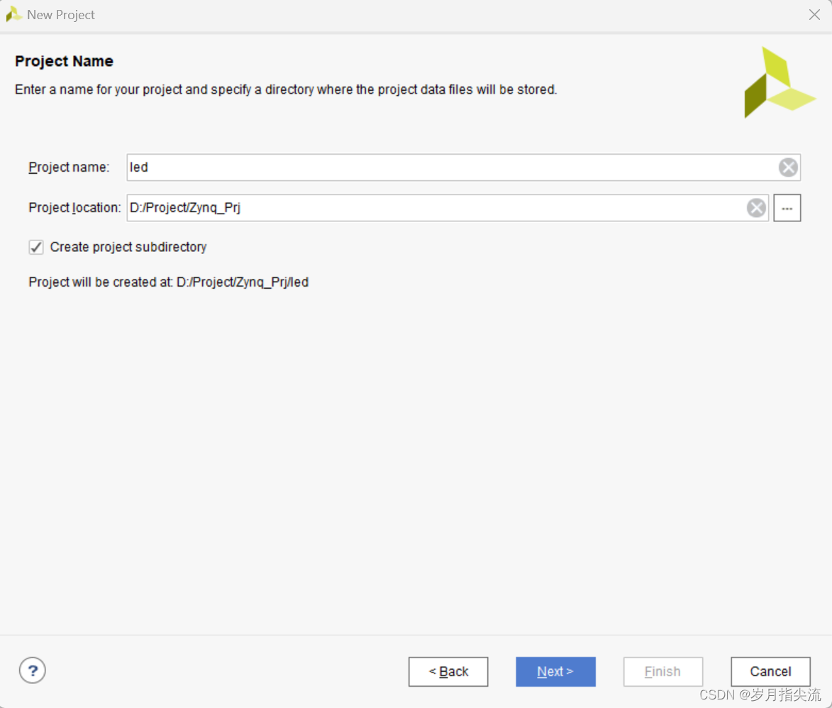 3、在弹出的对话框中输入工程名和工程存放的目录,我们这里取一个 led 的工程名。需要注意工程路径 “Project location” 不能有中文、空格,路径名称也不能太长。点击 next
