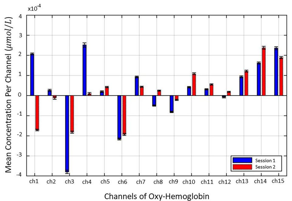 图3.HbO各通道的平均浓度。蓝色条代表第1阶段,红色条代表第2阶段。误差条表示平均值的标准误差,用于估计每个频道HbO平均浓度的可变性。星形表示第1组和第2组之间HbO的平均浓度有统计学上的显著差异。在所有通道中,两次会议之间的血流动力学差异明显不同。这暗示了判断人们冲动购买倾向的可能性。
