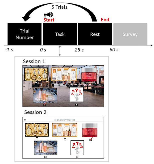 图2.实验方案示意图。我们指导参与者完成第一阶段(在网上免税店购物的任务)和第二阶段(在网上商店购物的任务)。实验结束后,进行自我报告测量。