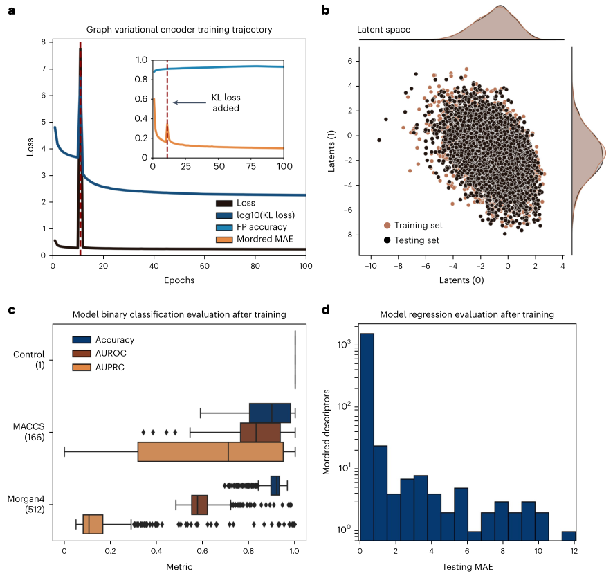 当使用来自SMILES字符串的分子图形进行训练时,图形隐空间自编码器通常在Morgan4和MACCS指纹上表现出超过90%的中位数准确率,而受试者操作特征曲线下面积(AUROC)和精确度-召回率曲线下面积(AUPRC)指标对于Morgan4指纹比MACCS指纹略低。这表明模型通常能够准确地预测二进制指纹,并因此能够准确解释分子图形和解析构成指纹的特定片段。隐变量在所有维度上也被认为近似地服从正态分布,接近0。没有添加Kullback-Leibler损失函数的情况下,隐空间显示出与高斯分布整体偏离更大和较大的个体隐空间值。Mordred指纹表现良好,大多数描述符的平均绝对误差(MAE)都小于1(图2d)。