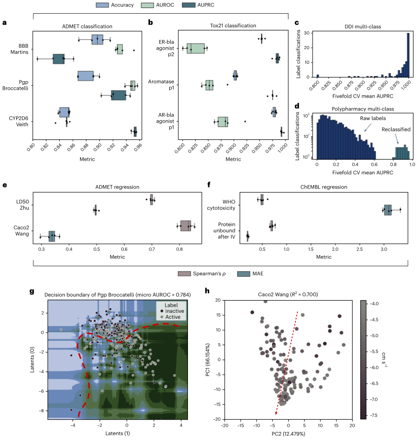 与其他测试的模型相比,使用额外的决策树分类器实现了最佳分类效果。该模型在预测血脑屏障通透性、P-糖蛋白结合和代谢相关蛋白CYP2D6亲和性方面表现良好(图3a)。TDCommons分类数据集的中位数AUROC为0.870±0.021,AUPRC为0.891±0.020。在Tox21数据集中,雄激素和雌激素受体拮抗剂和激动剂方面的表现也名列前茅(图3b),在与其他数据集的AUROC进行比较时,一般排名在第五位及以上。多类问题的DDI数据集也展现出AUPRC得分超过0.975(图3c)。TWOSIDES多药物治疗数据集在使用原始标签时显示出较低的AUPRC得分;当使用国际疾病分类第11版(ICD-11)将该数据集重新分类为26个副作用类别时,AUPRC得分提高至整体上超过0.75(图3d)。回归数据集的适用性也类似,LD50数据集和来自TDCommons数据库的肠上皮细胞渗透性预测良好,Spearman's ρ均超过0.7。