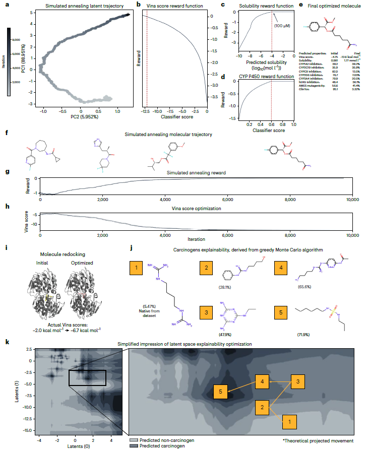 在Lagunin等人的致癌物数据集中,通过贪婪蒙特卡洛算法(Greedy Monte Carlo)逐渐选择具有致癌性质的非致癌分子,决策边界的描绘显示了药物的可解释性(图5k)。此外,所示的轨迹(图5j)显示了一个磺酰胺功能基团的形成,而磺酰胺的一个超集已经被证明在小鼠中极大地增加了肿瘤形成,并可以引起甲状腺滤泡细胞腺瘤。