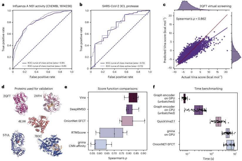 测试的模型性能出色,能够处理现有打分函数下的分类问题(图4a、b)和回归问题(图4c、d)。使用支持向量机,基于64维隐空间进行训练的替代模型通常不需要超过1分钟即可训练完成,用于10,000个数据点。将SMILES字符串解码为相应的隐空间所需的时间不到100毫秒/分子(图4f)。与现有打分函数相比,该方法加速了1.5至2个数量级。