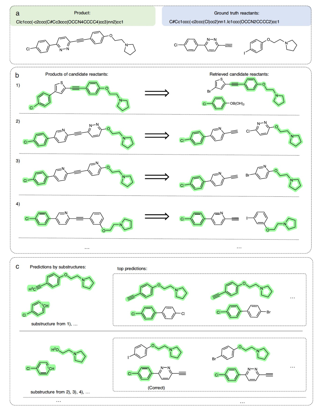 利用常见保留的亚结构的另一个好处是,与现有方法相比,该模型可以为用户提供在反向合成规划中做出决策时的额外见解。对于图2中所示的情况,产物可以通过多种类型的偶联反应合成。由于可以通过亚结构对预测进行分组,作者预测的反应物和反应类型可以帮助人类专家评估潜在的途径,并通过化学知识排除不可行的反应。如图2所示,与第一个候选反应物相关的反应是苯和噻吩环之间的Suzuki-Miyaura偶联反应,而与其余候选反应物相关的反应是Sonogashira偶联反应,三键是反应位点。这个例子表明,专业用户可以通过比较与检索到的候选反应物相关的反应来改进预测结果,使预测结果与现有的“黑盒”模型相比更具解释性和可靠性。