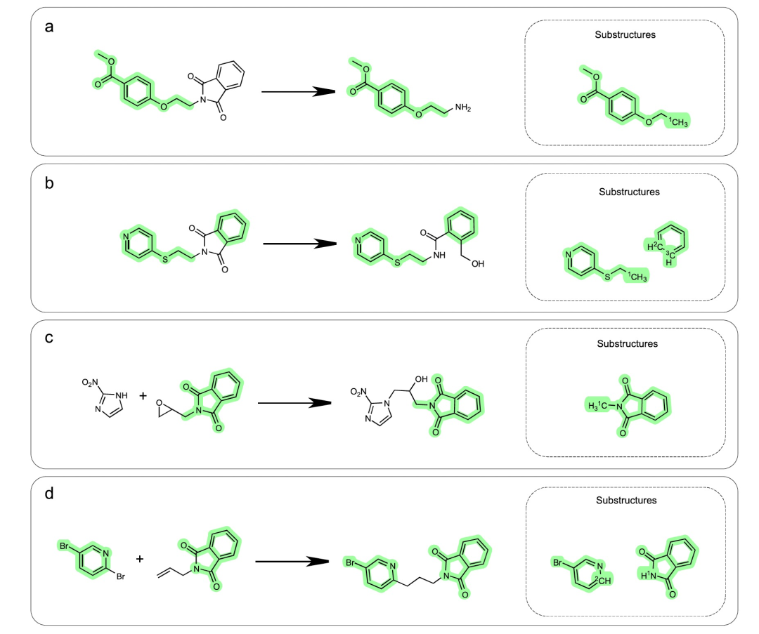 需要注意的是,提取的亚结构是特定于产物分子的,这有助于捕捉从反应物到产物的细微结构变化,这些变化是与特定反应相关的。邻二甲酰亚胺是一种常见的杂环亚结构。作者在图4中展示了四个示例反应,其中反应物中含有邻二甲酰亚胺。不同反应类型之间提取的亚结构是不同的。在模型的输出中,邻二甲酰亚胺在反应(a)和反应(b)中并不被认为是亚结构的一部分。反应(c)和反应(d)的亚结构是不同的,但它们都包含邻二甲酰亚胺。结果表明,亚结构是与产物相关的,这与作者的预期一致。