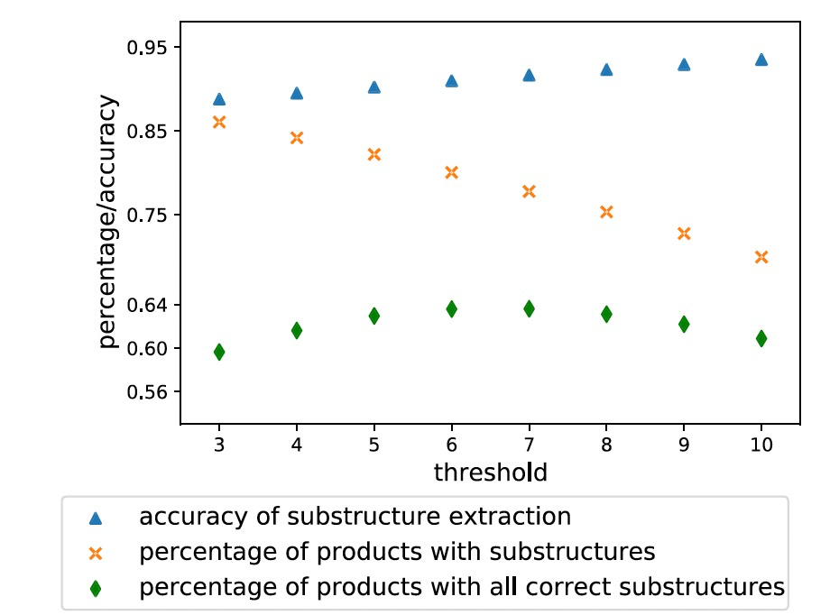 为了提高亚结构的提取准确性,可以根据检索到的候选物识别潜在的反应位点。另一种可行的方法是增加从检索到的候选物中选择常见指纹的阈值。值得注意的是,当前的实现要求常见指纹在至少20个检索到的候选物中存在5个以上,才能定义为成功的亚结构提取。图3显示了当阈值设置在3至10之间时,具有亚结构的产物的百分比、所有正确亚结构的产物的百分比以及亚结构的准确率。结果显示,随着准确率的提高,获得具有亚结构的产物的可能性单调下降,而具有所有正确亚结构的产物的百分比形成一个凸曲线,峰值大约在6左右。在本文中,作者将阈值设置为5,主要是因为这个设置平衡了相对较高的成功提取亚结构的产物的百分比和这些亚结构中较高的正确百分比。在测试数据上,即使产物和相关的候选物包含不正确的亚结构,正确亚结构的平均数量仍为7.3。这表明,在聚合结果后,即使亚结构提取结果部分不正确,模型仍然可以进行正确预测。