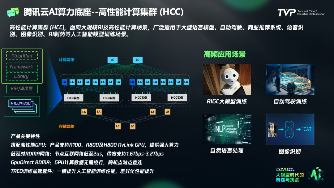 为了应对以上挑战,腾讯云推出了 AI 算力底座——高性能计算集群 HCC,可广泛应用于大模型、自动驾驶、商业推荐系统、图像识别等人工智能模型训练场景,其具有以下特性优势: