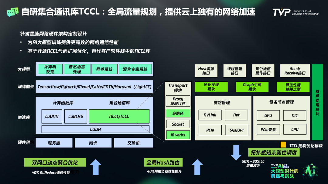 除了硬件支持外,腾讯云还提供了自研的集合通信库 TCCL,得益于自研的交换机架构,TCCL 实现了端网协同,解决流量负载不均的问题,可以在双网口环境下提升流量约 40%。同时提供拓扑感知亲和性调度功能,旨在最小化流量绕行。它具有动态感知能力,可根据最优顺序进行任务分配,避免通信数据拥堵。