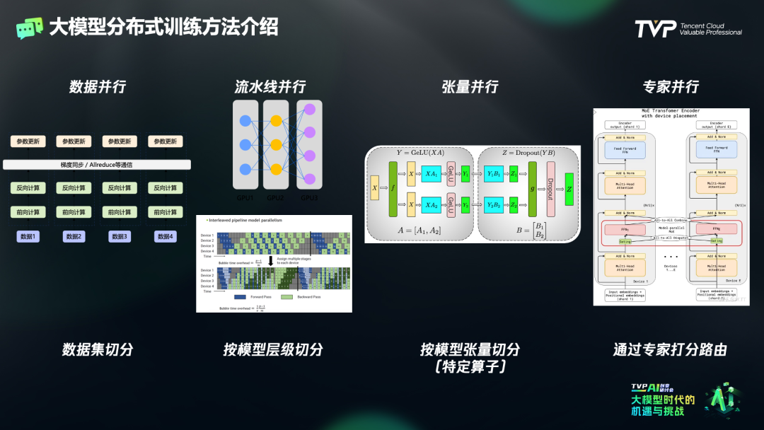 戚元觐老师提到,分布式计算可以充分利用多个 GPU 的计算资源,加快训练速度,并解决单个 GPU 内存不足的问题。不同的方法适用于不同的场景和模型结构,选择合适的并行策略可以提升训练效率和性能。