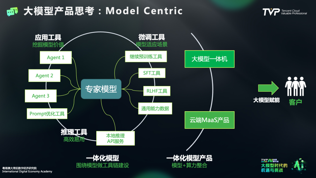 第二层封装是模型和算力整合封装,张家兴老师在这一方面正在和腾讯云展开合作,积极推进将模型和算力结合在一个大模型产品中提供给客户,做到“开箱即用”。